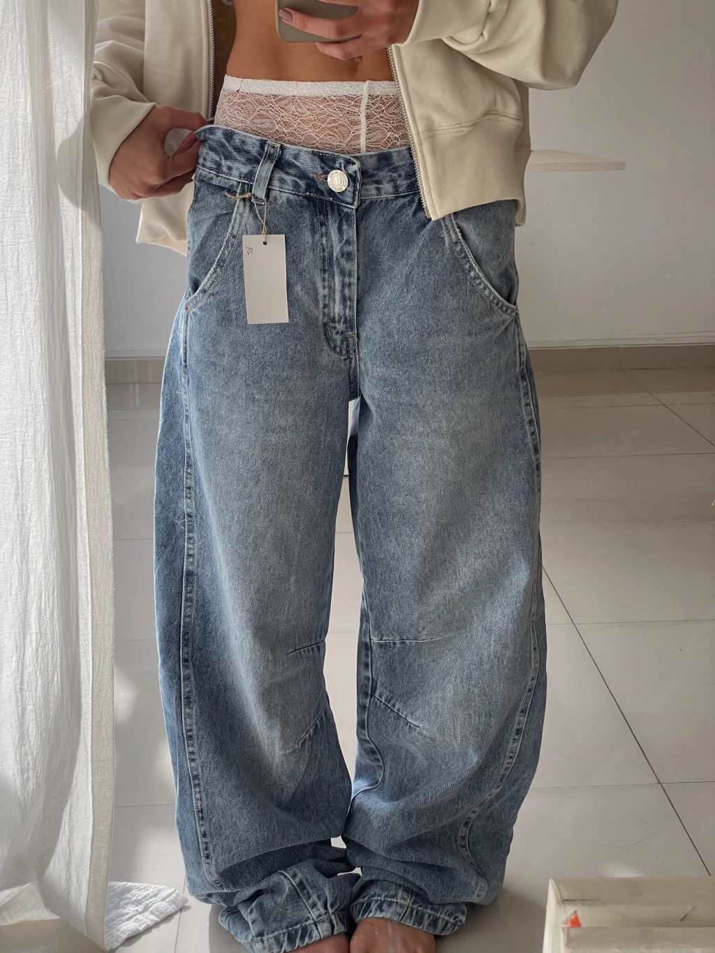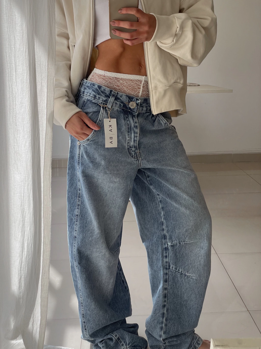 Baggy azul, de tiro medio/bajo, tiene costuras verticales, bolsillos delanteros a los costados, que le aportan funcionalidad y un toque moderno. Su diseño es amplio, sueltito y bien comodo, ideal para combinar en cualquier ocasión.
