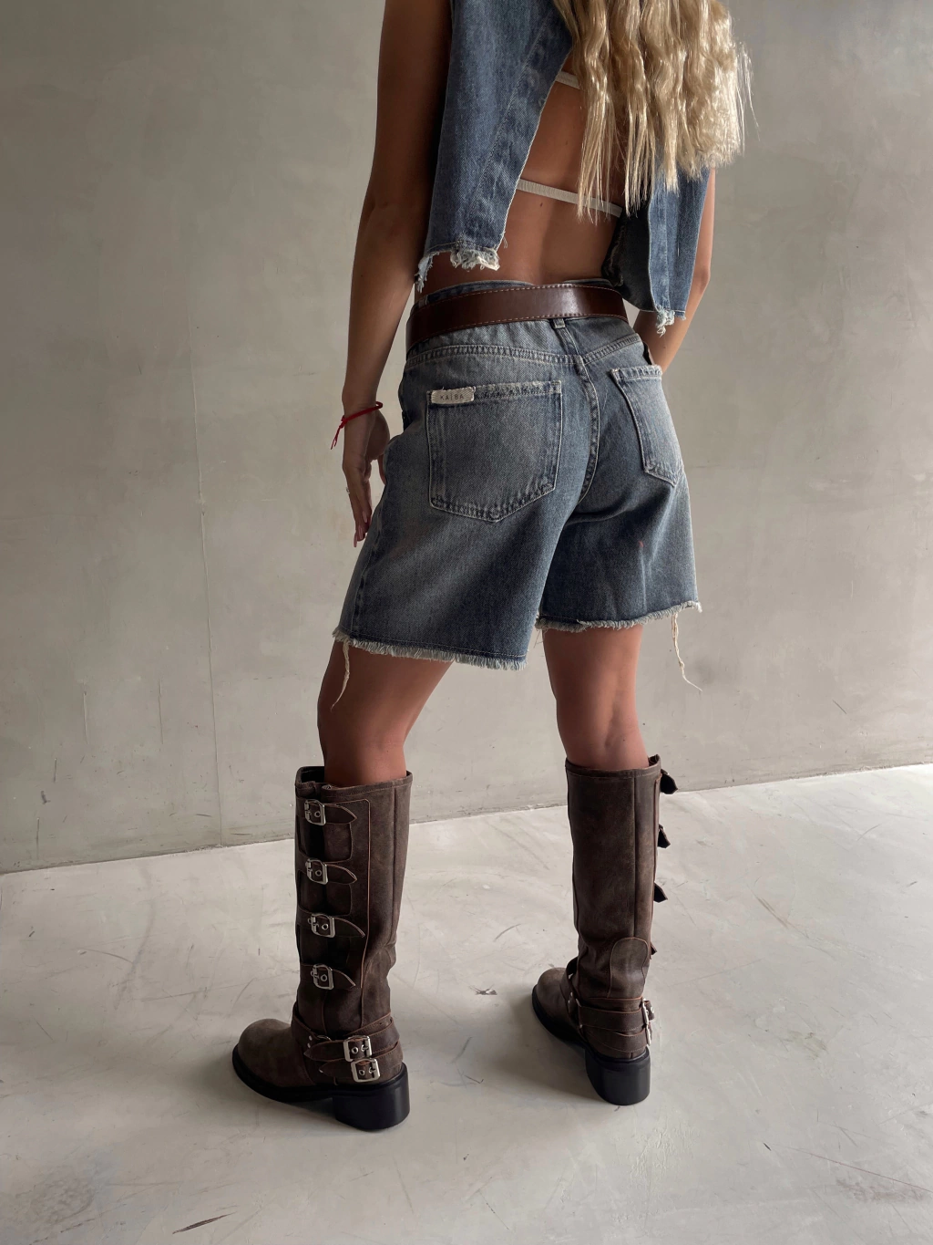 Bermuda de jean tiro medio. Es rígida en color azul intermedio matizado; con leve bigotes en el frente. Cuenta con el ruedo desflecado, sus costuras son en tono camel y los avíos que lleva son níquel.