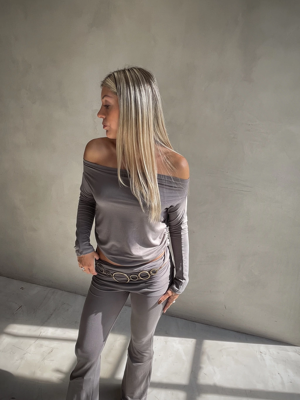 basica, versatil, y con personalidad. Tiene tiro medio y pierna levemente acampanada (estiliza). El detalle que la hace unica: una faja integrada de dos tiras anchas que poder atar, doblar, o dejar suelta segun tu estilo y como te guste llevarla. Le da ese toque distinto que levanta cualquier look y lo hace original.