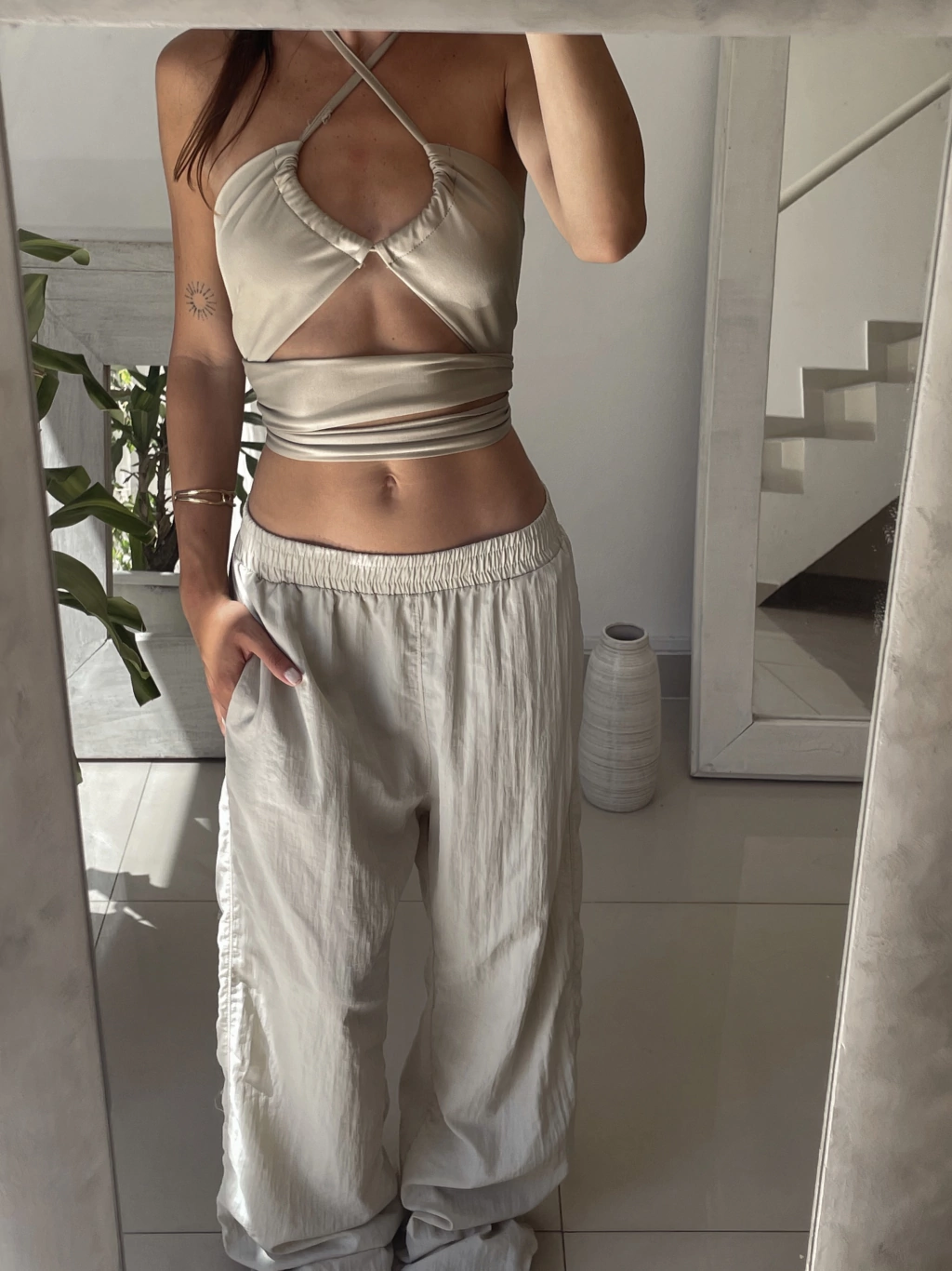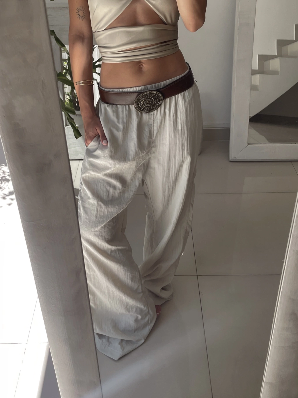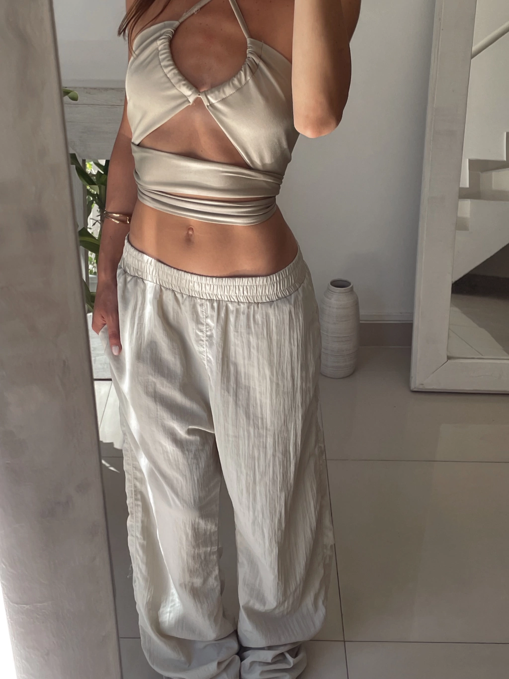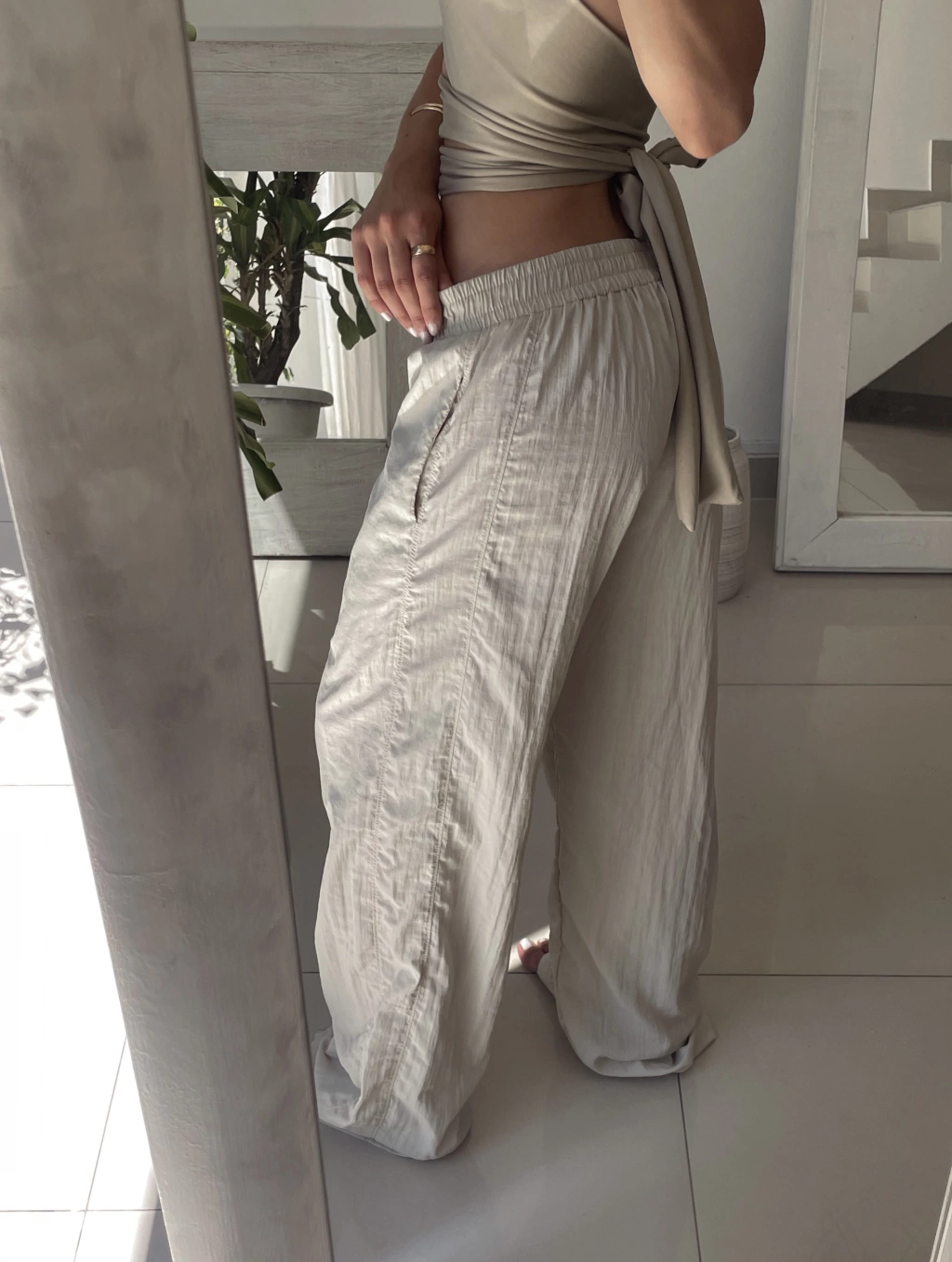 Pantalón recto de nylon liviano, con recortes