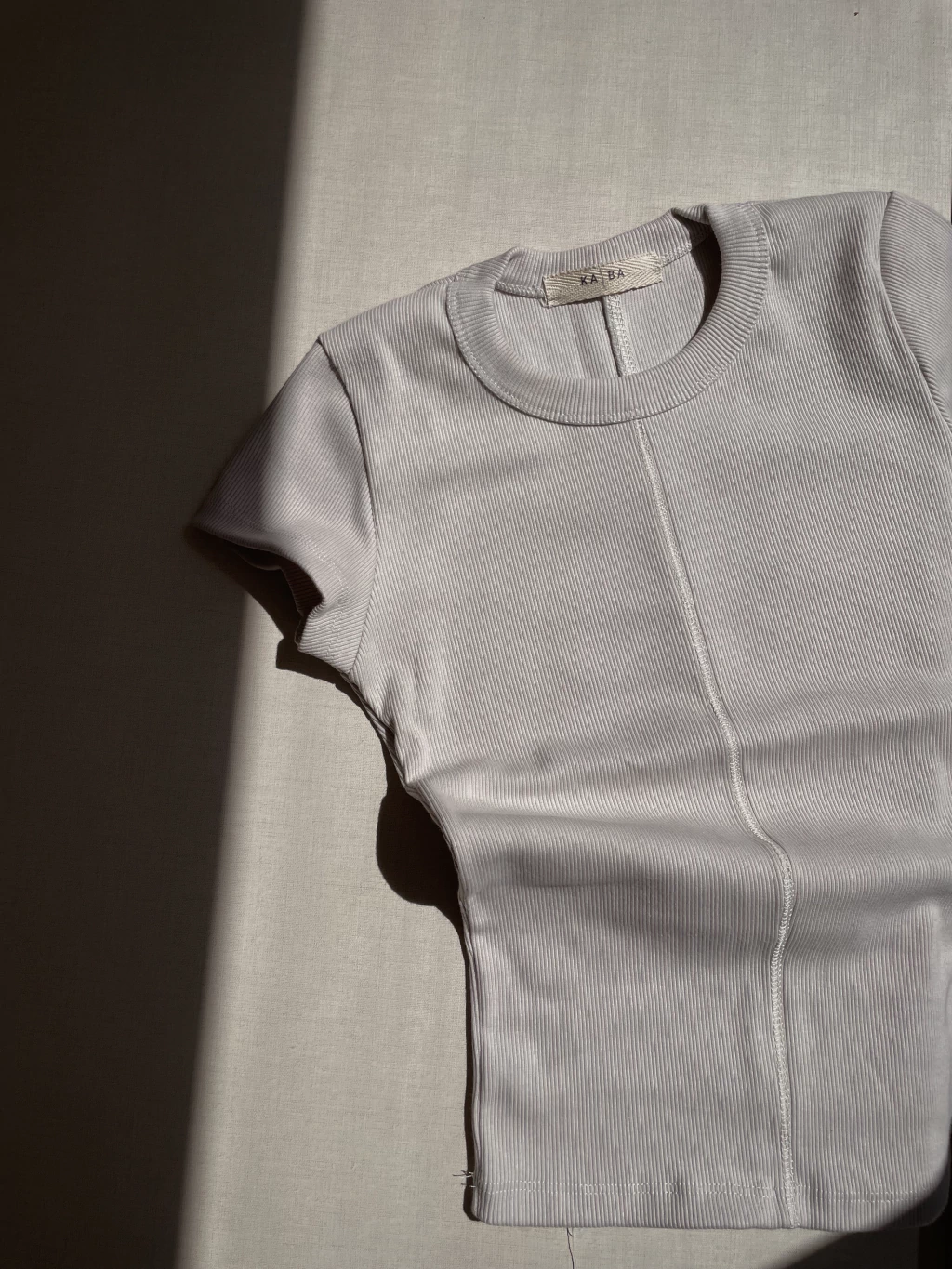 basica esencial en tono arena, manga corta de morley 100% algodon. Escote redondo ancho con terminacion en el mismo material y costura central que aporta un detalle sutil :)
